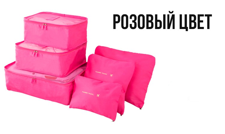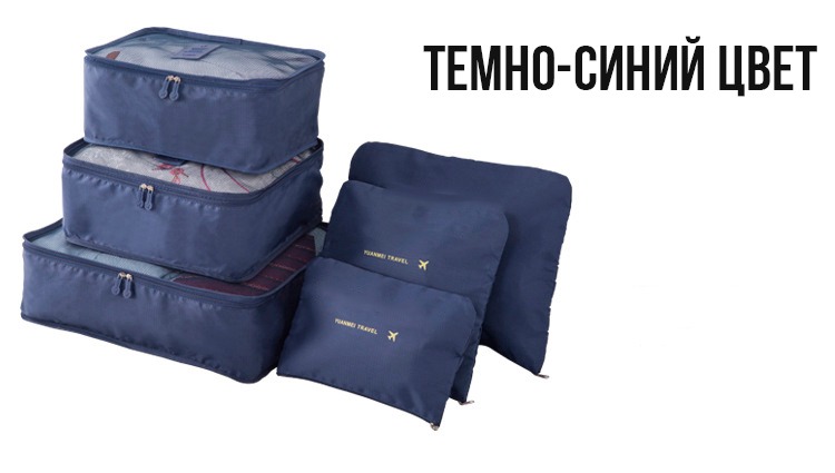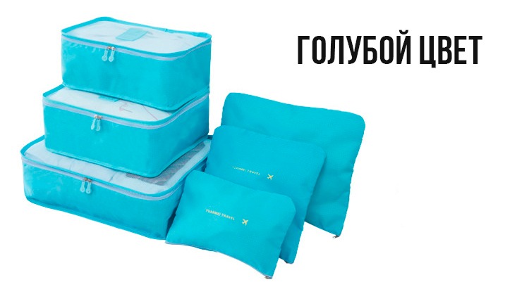 Набор состоит из 6 органайзеров, в которых поместится все необходимое вам в пути.Дорожные органайзеры изготовлены из прочного полиэстера и мягкой нейлоновой сетки. Сетка в верхней части чехлов предназначена для легкой идентификации содержимого и вентиляции. Они легкие и вмещают в себя большое количество предметов. Большие чехлы прекрасно подойдут для белья, одежды и обуви. А маленькие для предметов гигиены, лекарств, косметики или документов.