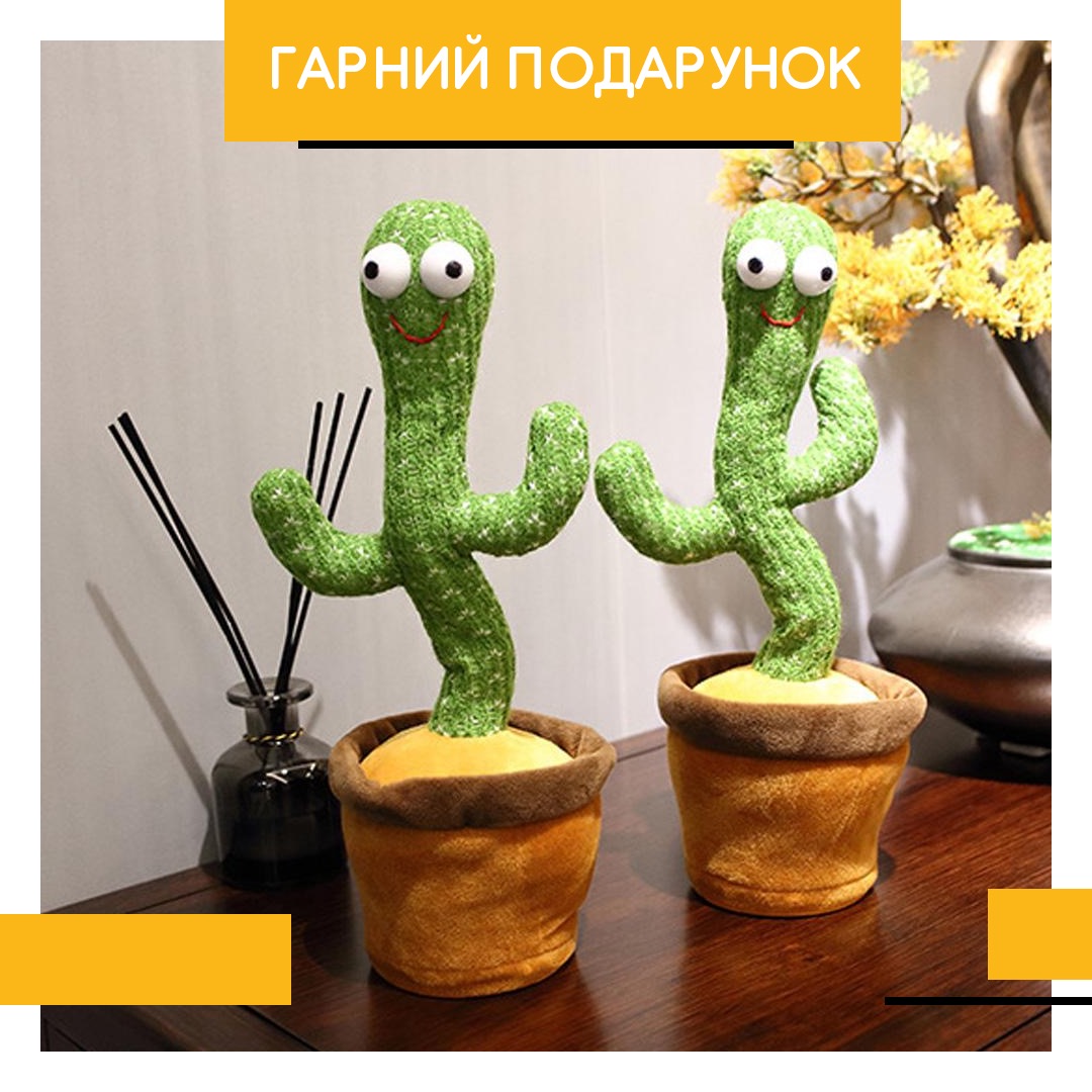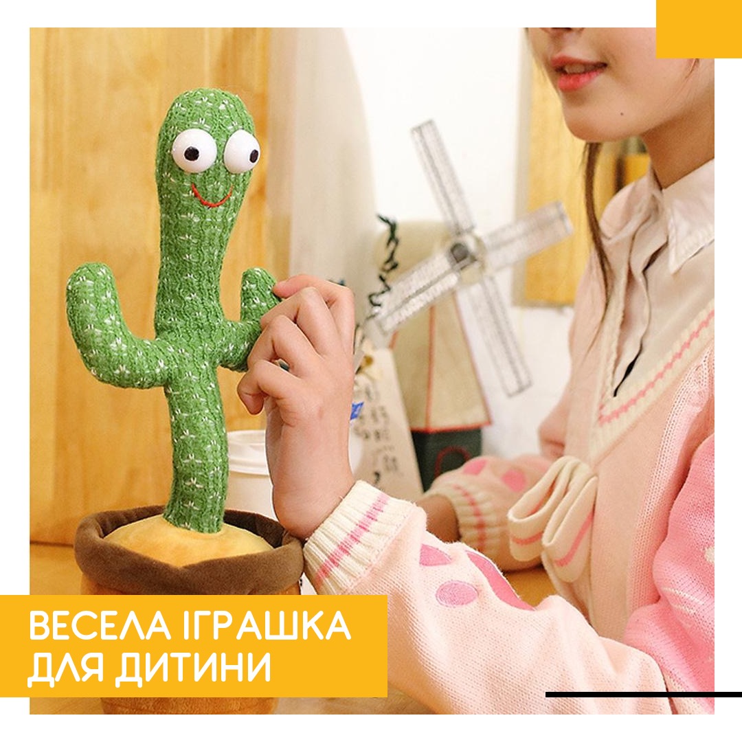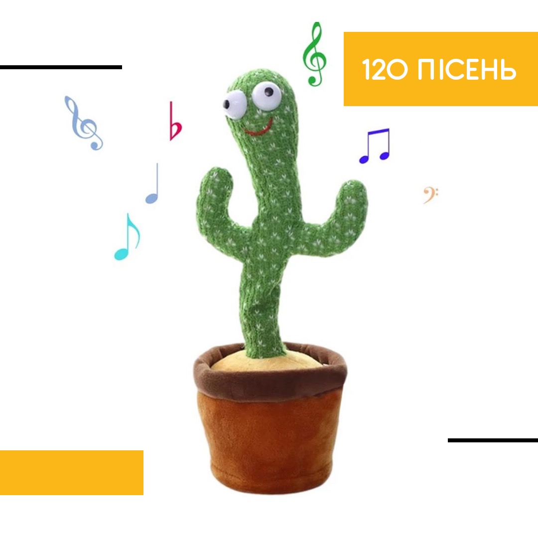 Співає 120 пісень, танцює зі світломузикою і повторює всі звуки навколо, що дуже приваблює дітей) Весела музика і танці підходять для створення приємної атмосфери і підходять для вечірок. Записуючий пристрій в кактусі запише будь-яке ваше пропозицію, яке Ви скажете поруч з танцюючим кактусом, і через 1-2 секунди він повторить ваші слова дуже смішним голосом і витонченим танцем! Функція запису мови 10 секунд. Ця забавна мила іграшка має висоту 34 сантиметрів.